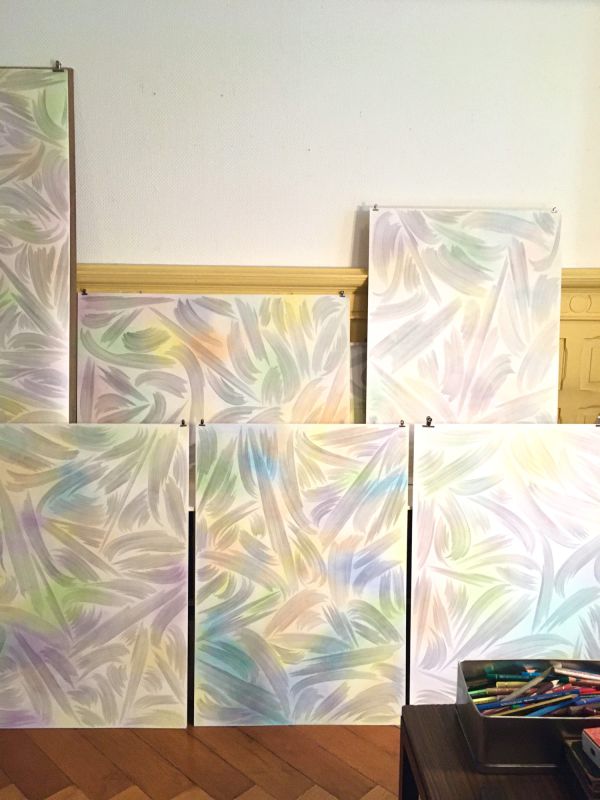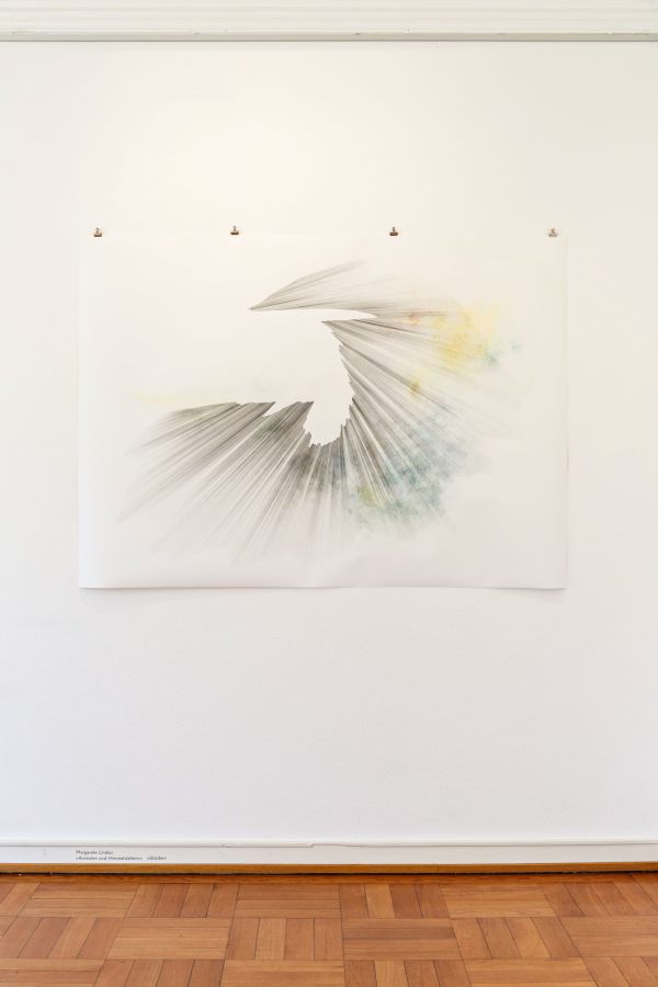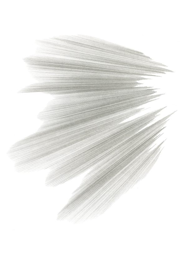 Am Lineal entlang ziehe ich scharfe Bleistiftstriche. Ich verschiebe das Lineal immer parallel für zwei Striche und fächere sie danach auf. Durch diesen mechanischen Prozess entstehen Bündel, Formen und plastisch wirkende Gebilde. Das Auge verbindet, erinnert sich: Strahlen, Flügel, Aureolen und Himmelsleitern. Die Himmelsleitern kann man besteigen. Zwischen den Sprossen ist Papier. Oder Luft.